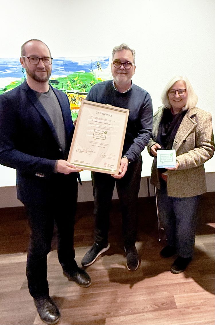 Die Re-Zertifizierung des Labels „Ökologisch und fair im Bistum Essen“ hat die Caritas Ruhr-Mitte jetzt bei der Caritas-Delegiertenversammlung Anfang November erhalten. Dr. Sebastian Neugebauer, Leiter der Abteilung Weltkirche und Mission im Bistum Essen, überreichte die entsprechende Urkunde. Als Vertretung von Weihbischof Ludger Schepers lobte Neugebauer das stetige Engagement des Verbandes bezogen auf ökologische Achtsamkeit, den Einkauf fairer Waren sowie die regelmäßige Kommunikation über diese Themen, zum Beispiel im Caritas-Newsletter und den Sozialen Medien. Das erste Zertifikat dieser Auszeichnung hatte der Verband im Jahr 2021 bekommen. In der Zwischenzeit erhielte die Caritas Ruhr-Mitte das Label „Gemeinwohlorientiertes Unternehmen - GWÖ“, das ebenso auf unsere ökologische und faire Ausrichtung einzahlt. Den Preis nahmen Alexander Mauer (Foto Mitte) und Petra Backhoff, als Nachhaltigkeitsbeauftragte, dankend im Rahmen der Versammlung entgegen.