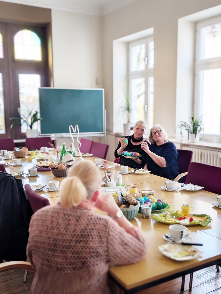 Der Frühstückstreff unserer Caritas-Kontakt- und -Beratungsstelle für Menschen mit psychischen Erkrankungen in Hattingen hat heute am Gründonnerstag einen kleinen Osterbruch gegeben. Zwölf Besucher*innen und Betreuer*innen ließen es sich bei selbstgefärbten Eiern, Brötchen und frischem Möhrenkuchen gutgehen. Die Klientinnen und Klienten hatten tolle Dekoration vorbereitet und die Kreativgruppe hatte die Ostereier gefärbt. Alle hatten damit einen schönen gemeinsamen Vormittag.